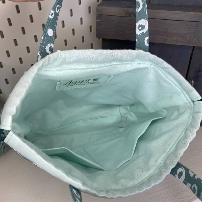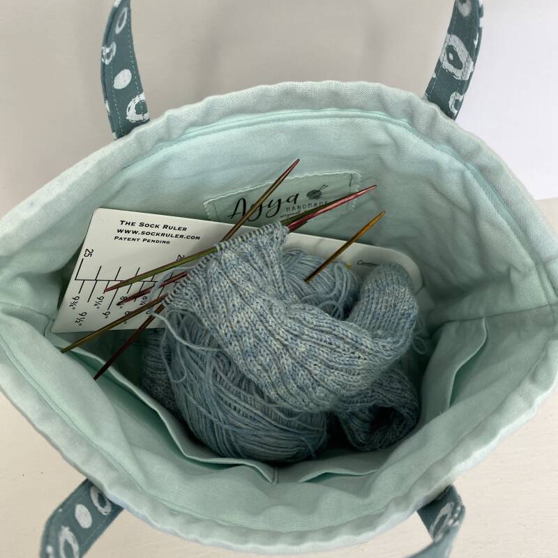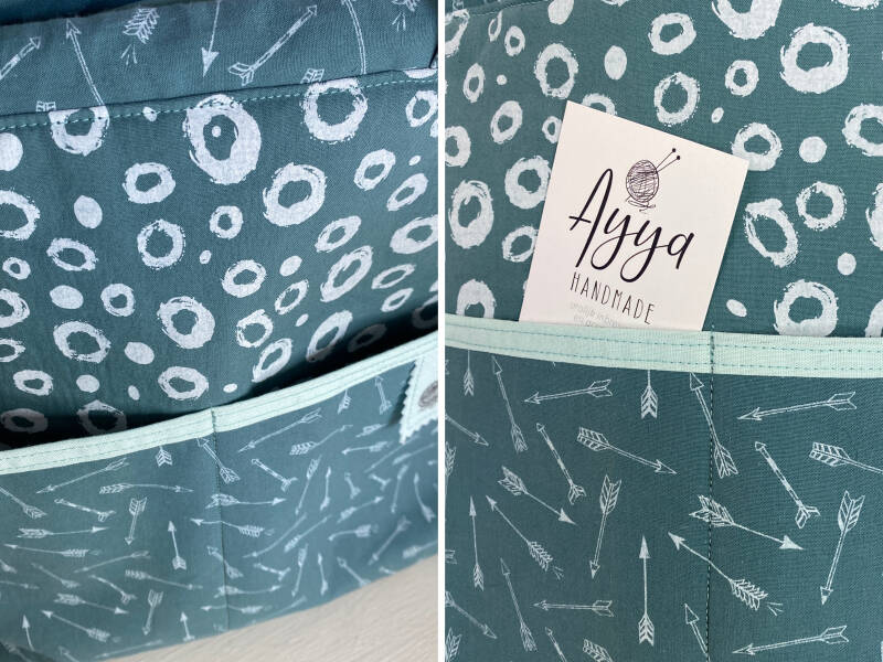 De kleine tas is ongeveer 22 cm hoog en aan de bovenkant 30 cm breed. De afmeting van de bodem is 21 x 10 cm. Dat is een mooie maat voor wat kleinere projecten, zoals een sjaal of sokken. Aan de binnenkant zitten twee steekzakken om je accessoires gescheiden te houden van je breiwerk.